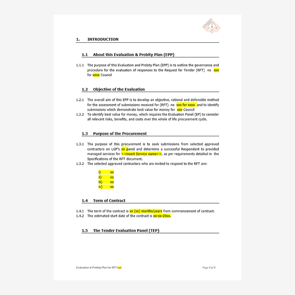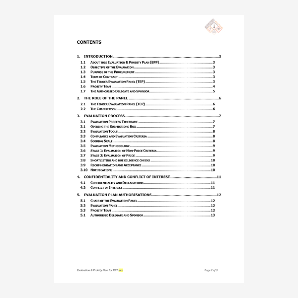 13 page document template, detailing the purpose of evaluation and probity, the roles & responsibilities, managing the evaluation, criteria, weights, scoring, shortlisting, interviews, presentations, selection, probity matters, and managing conflicts.
