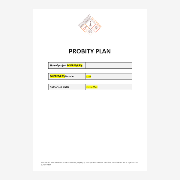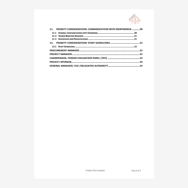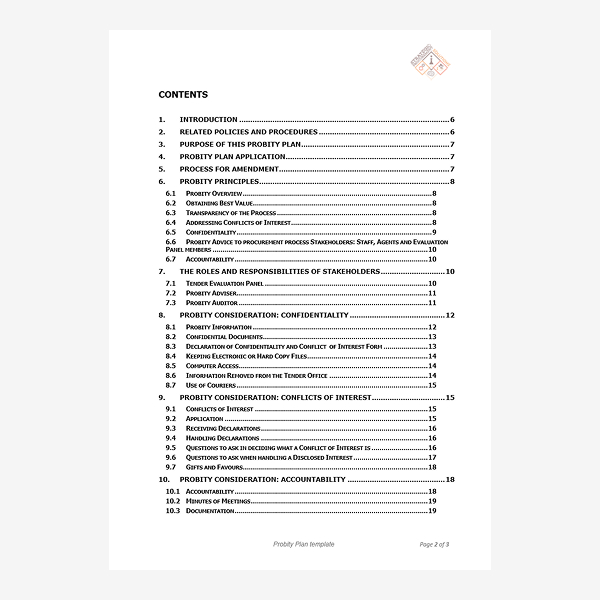 24 page document template, detailing the purpose of probity, the roles & responsibilities, managing probity matters, and managing conflicts.