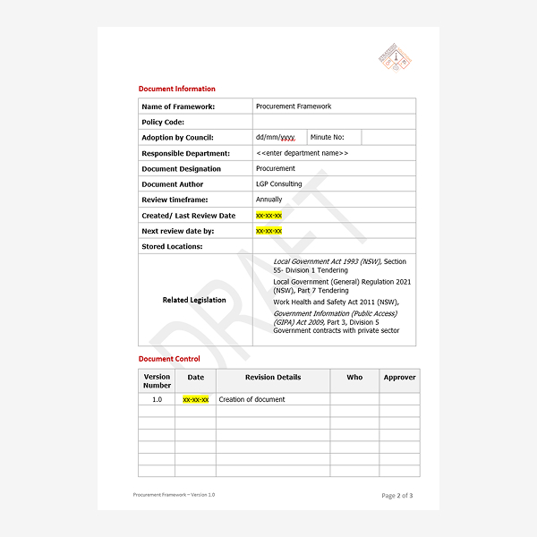 13 page document template, detailing a framework that sets out a structured set of policies, procedures, and guidelines that govern how goods and services are acquired to ensure transparency, value for money, and compliance with organisational or government standards