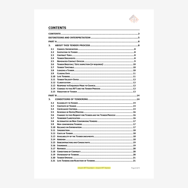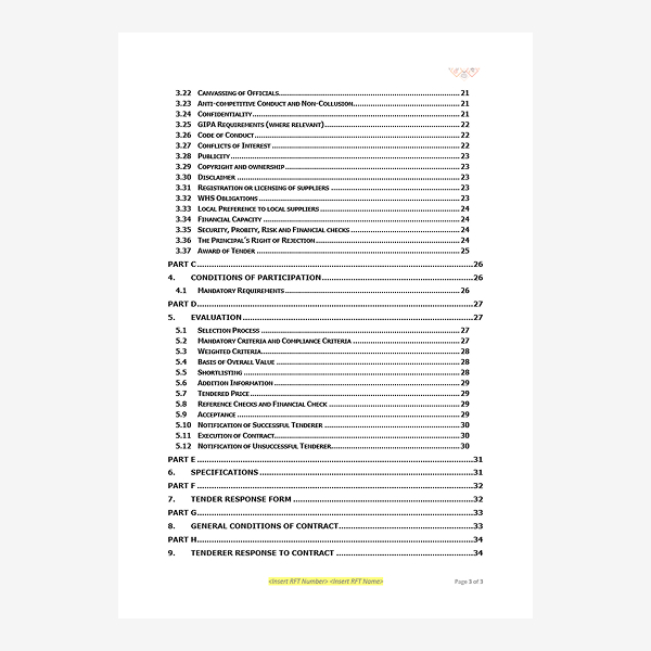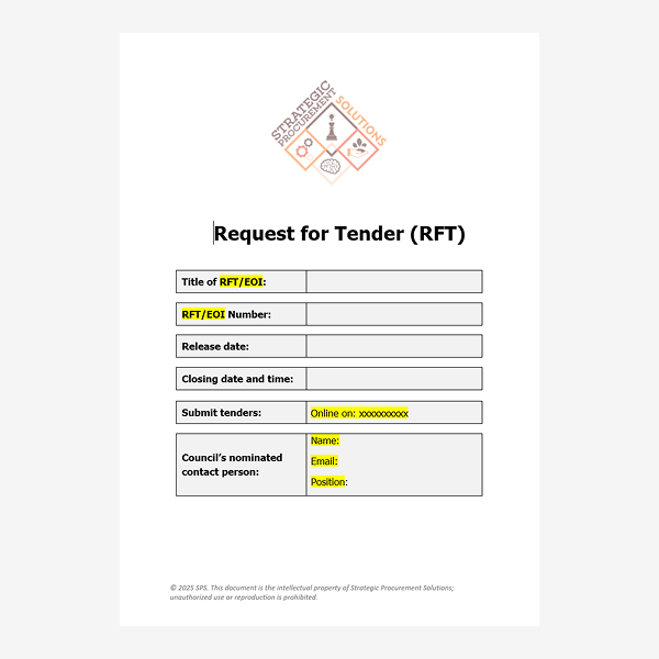 35 page document template, detailing the purpose of the procuremnt process (RFT) the requirement, the specificaiton, evaluation, criteria, weights, scoring, shortlisting, interviews, presentations, selection, probity matters, and managing conflicts.